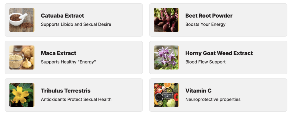 Catuaba extract: Catuaba extract is rich in components that boost male hormone levels. It helps boost your desires and enhances your mood. This ingredient supports healthy energy levels and boosts immunity. It treats and improves impotence.